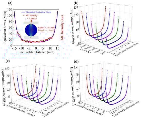 Stress–partial light intensity distributions along path A–A1 of the ML cylinders. (a) Relationship between the simulated equivalent stress and experimentally measured light intensity along path A–A1 obtained for the ML cylinder with r = 12.5 mm and l = 15 mm under a normal load of 2000 N. (b) Simulated equivalent stress contours obtained for the ML cylinder with r = 12.5 mm and l = 15 mm under normal loads ranging from 500 to 3000 N. (c) Simulated equivalent stress distributions along path A–A1 obtained for the ML cylinders with l = 15 mm and r = 10–15 mm under a normal load of 2000 N; (d) Simulated equivalent stress distributions along path A–A1 obtained for the ML cylinders with r = 12.5 mm and l = 10–15 mm under a normal load of 2000 N.