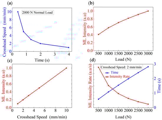 Relationships between the light intensity, the light intensity rate, and various parameters under different loading paths. (a) Crosshead Speed vs. time up to 2000 N; (b) applied force vs. normalized light intensity; (c) crosshead speed vs. normalized light intensity per unit of time. (d) Applied force vs. normalized light intensity rate at a crosshead speed of 2 mm/min.