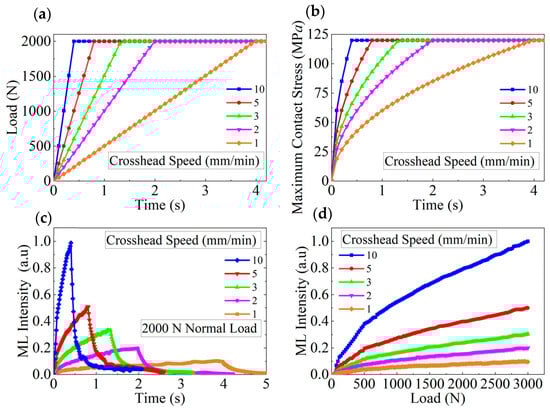 Relationships at different crosshead speeds. (a) Load versus loading time plotted at different crosshead speeds. (b) Maximum contact stress versus loading time at 2000 N plotted at different crosshead speeds. (c) Loading time versus normalized light intensity at 2000 N plotted at different crosshead speeds. (d) Applied force versus normalized light intensity plotted at different crosshead speeds.
