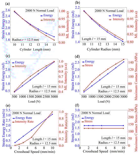 Relationships between the strain energy, strain energy rate, and other parameters determined for the ML cylinders of different sizes under various loading paths. (a) Light intensity as a function of strain energy plotted for the ML cylinders of different lengths. (b) Light intensity as a function of strain energy plotted for the ML cylinders of different radii. (c) Light intensity as a function of strain energy plotted at different applied forces. (d) Maximum contact stress as a function of strain energy plotted at different forces. (e) Light intensity rate as a function of strain energy rate plotted at different crosshead speeds. (f) Maximum contact stress as a function of strain energy plotted at different crosshead speeds.
