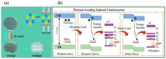 When the crosshead compresses an ML cylinder, the phenomena depicted in Figure 8 are observed. Figure 8a shows that without an external force, the charge centers of the cation and anion coincide. Upon application of a force, the charge centers shift slightly, generating a dipole moment [25]. The dipole moments of all crystal units in the stressed region combine to form a macroscopic internal electric field along the stress direction, inducing a local bandgap change. Figure 8b shows that electrons near the conduction band are released under stress, enter the conduction band, and then recombine non-radiatively with holes. The released energy is transferred to Bi3+ ions, generating blue–green emission through the 3P1,0 → 1S0 transition. This phenomenon demonstrates that the conversion of mechanical energy into light is driven by the dynamic stress, which excites and releases electrons and holes.