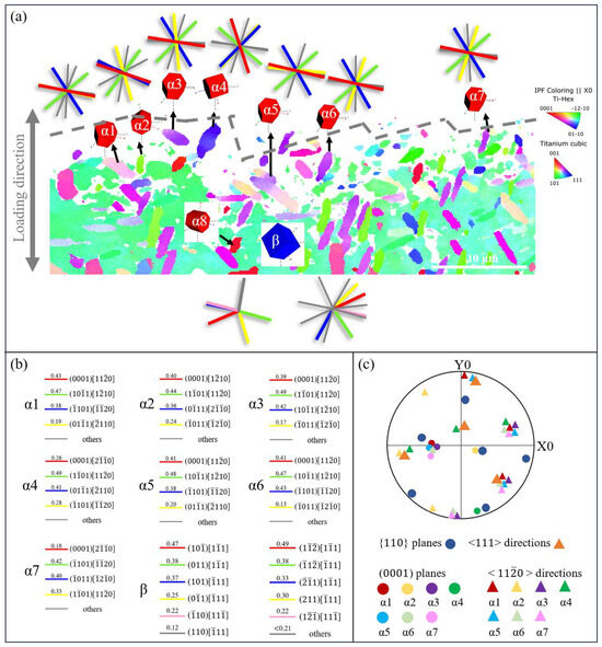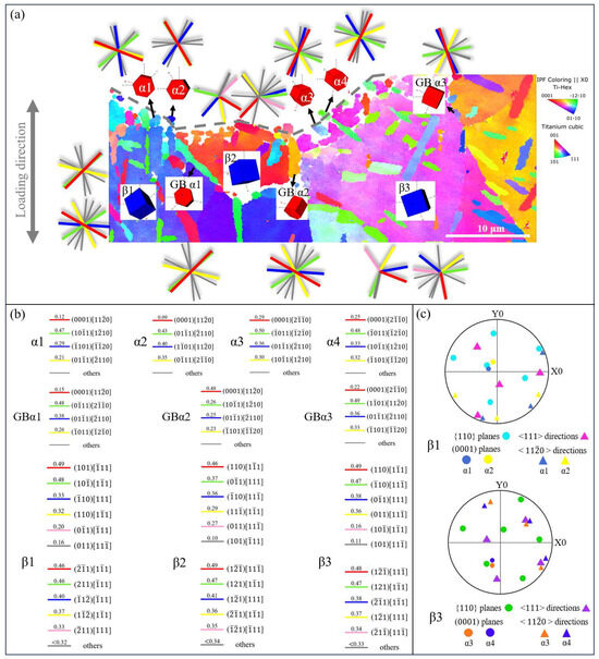 - Meng, L.; Kitashima, T.; Lin, P.; Zheng, L.; Jiang, Z.; Zhao, J. In situ EBSD investigation of microtexture evolution and slip activation of α macrozones during tensile deformation in Ti-6Al-4V alloy. Mater. Sci. Eng. A 2025, 924, 147739. [Google Scholar] [CrossRef]
