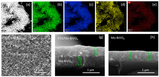 (a) TEM image of the Mo-BiVO4 PC underlayer and the corresponding (b) Bi, (c) V, (d) O, and (e) Mo EDX elemental maps. (f) Top view and (g) cross-section SEM image of the P25/Mo-BiVO4 bilayer structure. (h) Cross-section SEM image of the bottom Mo-BiVO4 layer.