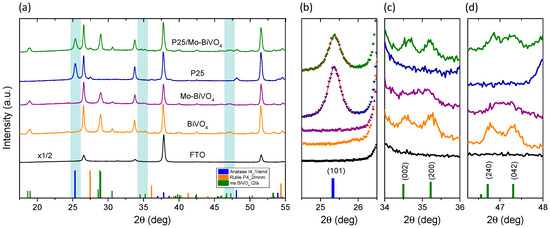This verifies that the introduction of Mo6+ dopants, which can substitute for V5+ cations in the BiVO4 lattice, moderate the monoclinic distortion of the ms phase towards the tetragonal scheelite (space group I41/a) structure [55]. However, a reentrant increase in the splitting and a narrowing of the ms diffraction peaks were observed for the P25/Mo-BiVO4 bilayer films (Figure 2c,d), suggesting the growth of Mo-BiVO4 crystallites following the post-thermal annealing that was applied during the deposition of the nanocrystalline P25 titania top layer. The XRD pattern of the individual P25 films deposited on FTO showed the characteristic mixed phase of P25 nanocrystalline titania, consisting of a major anatase (space group I41/amd) TiO2 phase along with secondary rutile (space group P42/mnm) phase [49]. However, deposition of the P25 layer on the macroporous Mo-BiVO4 inverse opal substrate resulted in the slight broadening of the main (101) anatase peak (Figure 2b), which indicates the possibility for a modified interfacial layer between the TiO2 and Mo-BiVO4 NPs during the post-annealing treatment.