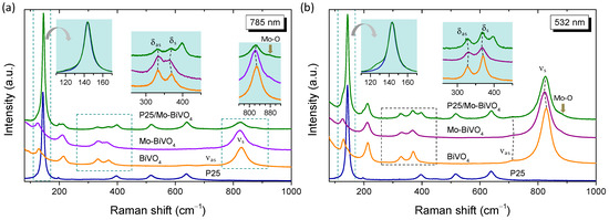 Raman spectra of the P25/Mo-BiVO4 bilayer in comparison to the single BiVO4, Mo-BiVO4 and P25 layers at (a) 785 and (b) 532 nm excitation wavelengths. Dashed boxes delineate the spectral regions that are shown in detail in the shaded insets. In the left inset for each laser excitation, the anatase Eg modes of the P25 and P25/Mo-BiVO4 films are compared after background removal at normalized intensity scale. Arrows indicate the weak shoulder that is associated with the Mo-O stretching vibration for the Mo-BiVO4 layers.