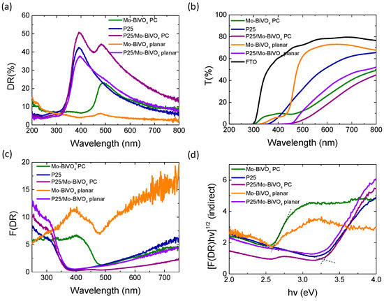 (a) Diffuse reflectance (DR%), (b) transmittance (T%) and the corresponding (c) Kubelka–Munk absorption, and (d) Tauc plots of the individual layers and the P25/Mo-BiVO4 bilayers.
