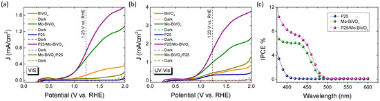 Photocurrent density-potential (J-V) curves for the P25/Mo-BiVO4 and Mo-BiVO4/P25 films in comparison to the individual layers and BiVO4 reference under (a) visible and (b) UV–Vis back-side illumination in 0.5 M NaHCO3 aqueous electrolyte. (c) IPCE spectra at 1.23 V vs. RHE potential for the P25/Mo-BiVO4 bilayer with respect to the P25 and Mo-BiVO4 constituent layers.
