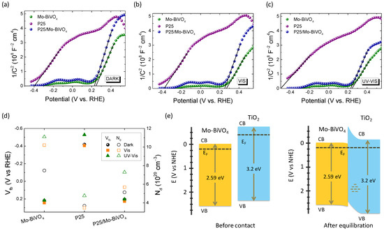 Mott–Schottky plots for the P25/Mo-BiVO4 bilayer in comparison to the Mo-BiVO4 and P25 individual films under (a) dark, (b) visible, and (c) UV–Vis light illumination in 0.5 M NaHCO3 aqueous electrolyte. (d) The derived values of Vfb and ND and (e) tentative band alignment for the Mo-BiVO4/TiO2 heterojunction before and after Fermi level equilibration.
