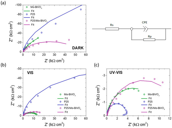 In order to investigate charge carrier recombination, EIS experiments were performed under visible and UV–Vis light as well in the dark for the P25/Mo-BiVO4 bilayer compared to the individual layers (Figure 7). The Nyquist plots were fitted to a Randles equivalent circuit consisting of a series resistance RS, the charge transfer resistance RCT at the electrode/electrolyte interface, and a constant phase element CPE (Table 1). Under light irradiation, the films presented lower RCT compared to dark conditions due to the generation of electron-hole pairs. Visible light irradiation resulted in markedly reduced RCT values for the Mo-BiVO4 and P25/Mo-BiVO4 bilayer in comparison to the P25 films.