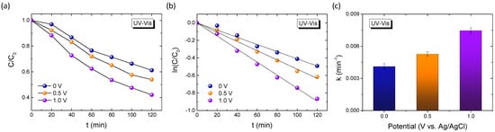 (a,b) IBU photoelectrocatalytic degradation kinetics and (c) corresponding kinetic constants for the P25 films in 0.1 M NaHCO3 supporting electrolyte at bias potentials of 0, +0.5, and +1.0 V vs. Ag/AgCl under UV–Vis illumination.