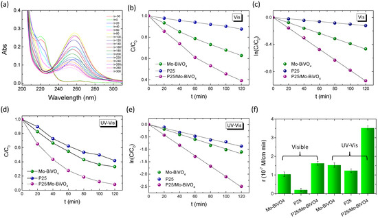 IBU photodegradation was accordingly performed in 0.1 M NaHCO3 supporting electrolyte at applied potential +1.0 V vs. Ag/AgCl under visible and UV–Vis light. The reaction kinetics monitored by the corresponding IBU absorbance spectra (Figure 9a) followed pseudo first-order kinetics under both illumination conditions (Figure 9b–e). The photocatalytic reaction rates rVis and rUV-Vis were calculated as r = kC0, independent of differences in the initial concentration C0 after dark adsorption. The degradation of IBU was accompanied by the appearance of a new red-shifted absorption band at about 257 nm, indicative of the formation of reaction intermediates, the most prominent being 4-isobutylacetophenone [64]. The corresponding band reached maximum intensity after 80 min of photocatalytic treatment under UV–Vis light (Figure 9a), while illumination for longer times resulted in its continuous reduction signaling the side group oxidation and oxidative opening of the IBU benzene ring towards mineralization [63,64]. The P25 films showed rather weak reactivity due to the inherently low visible light absorbance of both anatase and rutile TiO2 polymorphic phases [65], which increased considerably under UV–Vis light causing electron-hole excitation in P25 titania. The pristine Mo-BiVO4 photoelectrodes showed smaller differences in their photocatalytic activity under visible and UV–Vis light, reflecting their intrinsic visible light activation below 490 nm. More importantly, the P25/Mo-BiVO4 bilayers presented the highest performance that exceeded the sum of the reaction rate for the individual P25 and Mo-BiVO4 layers by approximately 30 and 28% under visible and UV–Vis light, respectively.