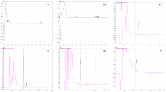 Absorbance spectra of (a) IBU and (b) the degradation product. HPLC chromatograms of IBU in the presence of P25/Mo-BiVO4 films under UV–Vis light for (c) 0, (d) 1, (e) 2, and (f) 5 h.