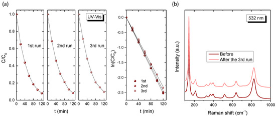 The stability of the P25/Mo-BiVO4 bilayer photocatalyst was evaluated by performing three consecutive IBU photoelectrocatalytic degradation tests under UV–Vis light using the same film. The film was subjected to intermediate photocatalytic cleaning of pollutant residues under UV–Vis illumination for 3 h in DI water (Figure 11a). The derived kinetic constants decreased successively from 0.0210(2), to 0.0202(2) and 0.0193(2) min−1, after the 2nd and 3rd run, respectively, indicating substantial stability and resistance to photocorrosion given the lack of any co-catalyst or surface treatment of the bilayer photoanode [25]. This was corroborated by Raman measurements of the bilayer film before and after the 3rd photocatalytic test, which showed no sign of film degradation (Figure 11b). Further application and validation of the P25/Mo-BiVO4 bilayer photoanodes can be accordingly envisaged in the photoelectrocatalytic degradation of other recalcitrant nonsteroidal anti-inflammatory drugs for water purification, which can be effectively combined with simultaneous hydrogen generation at the cathode under solar light.