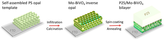 In addition to compositional engineering, tailoring the morphology of BiVO4 in the form of nanoporous photoanodes has been keenly pursued in order to enhance light harvesting and assist charge separation for photocatalytic applications [29,30,31,32]. Among different morphologies, nanocomposite photonic crystals (PCs) have been attracting attention for advanced photoelectric and absorption devices [33,34,35]. Inverse opals have been the most common three-dimensionally ordered structure, which, besides the selective enhancement of light harvesting via slow photons, offers a macroporous interconnected network that facilitates molecular transport and adsorption during photocatalytic reactions [36]. Nanoparticulate BiVO4 inverse opals have been successfully applied as visible light-activated photocatalysts in powder form [37,38], while Mo-doped BiVO4 inverse opal photoelectrodes have shown excellent performance in photoelectrochemical water splitting [39], especially after surface decoration by Au [40] and Ag [41] plasmonic NPs. Recently, markedly improved activity was reported for Mo-BiVO4/Ca-BiVO4 homojunctions [42] and (Ag, Au) plasmonic-modified Mo-BiVO4 inverse opal films [43] in the visible light photoelectrocatalytic degradation of pharmaceutical emerging contaminants. Heterostructuring of BiVO4 with benchmark TiO2 photocatalysts has been the subject of particular interest, where post-deposition of BiVO4 NPs has been commonly employed for the visible light sensitization of TiO2 inverse opals that were applied in the photocatalytic degradation of dye pollutants [44,45]. Likewise, BiVO4 NP decoration has been exploited for the improvement of water splitting over WO3 inverse opal photoanodes [46] as well as a nanocrystalline coating layer on top of WO3 [47] and TiO2 [48] inverse opal photoelectrodes leading to high photocurrent densities. Recently, BiVO4 NPs deposition on single [49] and bilayer [50] TiO2 inverse opal films resulted in greatly enhanced photocatalytic degradation rates of rhodamine B dye upon slow photon tuning, while significant enhancement of water oxidation was reported for a thin Mo-BiVO4 photoanode when coated with a TiO2 inverse opal layer with suitable photonic band gap with respect to the BiVO4 absorption edge [51].