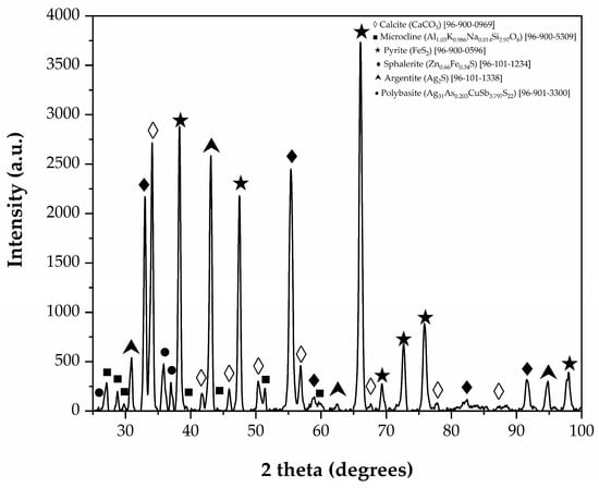 Figure 2 presents the diffractogram of the tailings sample along with the corresponding mineral identification using Match software (version 3). The peaks identified in the diffractogram correspond to calcite [(CaO3) (96-101-0963)] and microcline [(Al1.03K0.986Na0.014Si2.97O8) (96-900-5304)], pyrite [(FeS2) (96-901-0596)], sphalerite [(Zn0.66Fe0.34S) (96-101-1234)], argentite [(Ag2S) (96-101-1338)], and polybasite [(Ag31As0.203CuSb3.797S22) (96-901-3300)]. These results suggest that silver leaching may not be fully efficient, since part of the silver is present in the form of polybasite, a sulfosalt that is difficult to oxidize [49]. Additionally, it is worth mentioning that the mineral phases identified in this study have also been reported in other research exploring similar tailings [50,51], albeit from a different area within the deposit.