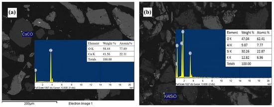 EDS micrographs obtained with backscattered electrons corresponding to the head mineral. (a) Calcite (CaCO3) and (b) feldspar (KAlSi3O8).