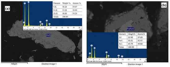 Micrograph and EDS spectra obtained through backscattered electrons of zinc (ZnS) (a) and iron (FeAsS) (b) species.