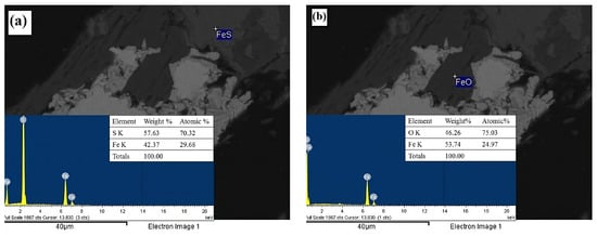 The spot analyses using energy dispersive spectroscopy (EDS) confirmed the abundant presence of calcite (CaCO3, Figure 3a) and feldspar (KAlSi3O8, Figure 3b), the latter being associated with microcline. This characterization also identified mineral phases such as sphalerite (ZnS, Figure 4a) and arsenopyrite (FeAsS, Figure 4b). EDS analysis further confirmed the presence of pyrite (FeS2, Figure 5a) and wüstite (FeO, Figure 5b) as iron-contributing mineral phases. Consequently, the presence of sulfides suggests that pyrite, sphalerite, and arsenopyrite may lead to acid drainage. This occurs because the exposure of these sulfides to moisture and an oxidizing agent, such as atmospheric air, promotes the generation of acid drainage; see Equations (16)–(23) [52,53,54].