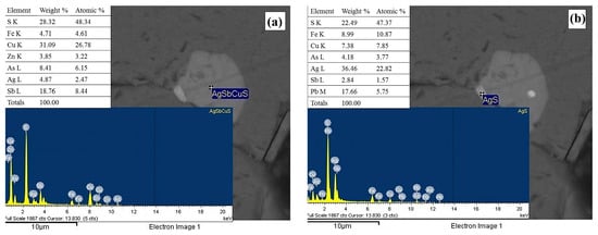 On the other hand, for the mineral phases contributing copper and silver, EDS analyses confirmed the presence of polybasite ((Ag,Cu)16Sb2S11, Figure 6a) and a silver sulfide (argentite, Figure 6b), with both phases previously identified by XRD. However, the micrographs reveal a natural association between polybasite and argentite, similar to that observed with other sulfides such as galena, pyrite, and arsenopyrite [57,58].