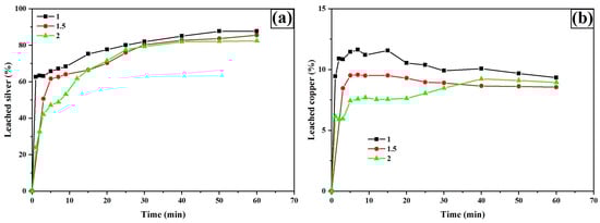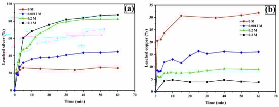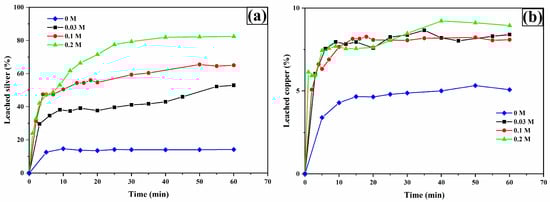 Figure 7a shows the percentage of silver leaching. As can be seen, the percentage of silver leaching increases with higher TU concentration. The maximum value of silver leaching at 60 min is 52.96%, 65.05%, and 82.40% for 0.03 M, 0.1 M, and 0.2 M, respectively. However, the results show that the presence of TU is important, since in its absence (0 M TU) about 15% is leached.