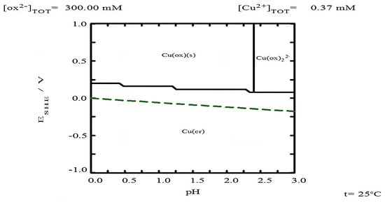 As for copper (Figure 7b), it is observed that in the absence of TU, the percentage of copper leaching was around 5.22% at 20 min. This percentage does not increase, probably because equilibrium is reached in the leaching solution for the formation of copper oxalate, as shown in the Pourbaix-type diagram in Figure 8, which was created with the free version of MEDUSA© software (Making Equilibrium Diagrams Using Simple Algorithms), which can be downloaded from the following page https://www.kth.se/che/medusa/downloads-1.386254 (accessed on 1 January 2025) [59], and described by Equation (32).