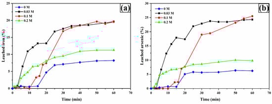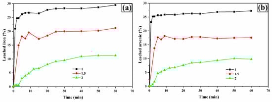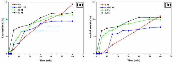 The analysis of iron (Figure 9a) and arsenic (Figure 9b) leaching shows similar behaviors, suggesting that the leaching process for these metals originates from the oxidation of arsenopyrite. This is deduced from the dissolution percentage ratios of Fe and As at 60 min in the presence of 0.2 M TU, with values of 19.44% and 25.68% (As/Fe ratio of 1.32), which is numerically close to the 1.34 ratio derived from the molecular weights of As and Fe in the arsenopyrite chemical formula.