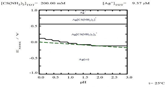 Eh-pH diagram for [Ag] 9.7 × 10−⁶ M with 0.2 M thiourea at 25 °C. Diagram generated using MEDUSA© software.