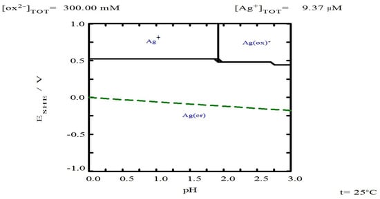 Eh-pH diagram for [Ag] 9.37 × 10−⁶ M with 0.3 M oxalate at 25 °C. Diagram generated using MEDUSA© software.
