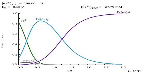 Species distribution diagram for Fe with 0.2 M oxalate as a function of pH. Conditions: 0.02779 M Fe and 0.2 M oxalate at 25 °C. Diagram generated using MEDUSA© software [59].