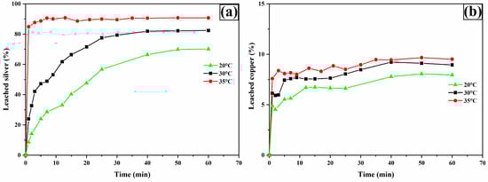 Leaching curves for silver (a) and copper (b). Experimental conditions: [TU] = 0.2 M L−1, [Ox] = 0.2 M L−1, sample weight = 10 g, pH = 2, temperatures = 20, 30, and 35 °C, stirring speed = 600 rpm, solution volume = 0.5 L, particle size = −53 + 37 μm.