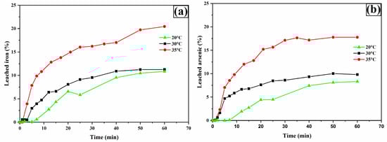 Leaching curves for iron (a) and arsenic (b). Experimental conditions: [TU] = 0.2 M L−1, [Ox] = 0.2 M L−1, sample weight = 10 g, pH = 2, temperatures = 20, 30, and 35 °C, stirring speed = 600 rpm, solution volume = 0.5 L, particle size = −53 + 37 μm.