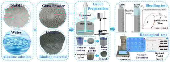 The use of WGP as a supplementary cementitious material (SCM) is feasible and holds great potential for development. Mirzahosseini et al. [50] investigated the effects of glass powders with particle size distributions of 0–25 μm, 25–38 μm, and 63–75 μm on cement mortar, and found that mortar with particles in the 0–25 μm range exhibited the highest compressive strength. Therefore, utilizing milled WGP as an SCM to partially replace cement in the production of low-carbon cement represents an effective approach to promoting the efficient utilization of waste glass resources. The performance of waste glass composites is influenced by various factors such as the water-to-cement ratio, glass particle size, dosage, and curing age [51]. Although there have been reports on the performance of concrete incorporating cementitious materials composed of glass sand or glass powder, a consensus on their effects on concrete material performance has not yet been reached [52,53,54,55]. Currently, there is limited research on the impact of WGP on the basic grouting properties of cement-based grouting materials [56,57,58]. Therefore, this study focuses on using WGP as a partial cement replacement to prepare grouts with different water–solid ratios (w/s = 0.5–1.0). It systematically explores the influence of WGP content (0–40%) on the stability and rheological properties of WGP–cement-based grouts with and without the addition of NaOH activator at various w/s ratios, the implementation process of the research is illustrated in Figure 1. The study also analyzes the mechanism of waste glass powder’s impact on the stability and viscosity of cement grouts. This study aims to provide a novel approach for the application of waste glass in the field of grouting engineering, elucidate the effects of WGP on the stability and rheological properties of grout, and conduct a preliminary exploration of the use of waste glass in grouting applications.