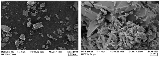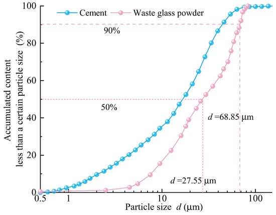 Previous studies have shown that as the fineness of glass powder increases, its pozzolanic activity is gradually enhanced [60]. Aliabdo et al. [61] found that by replacing 10% of cement with glass powder particles smaller than 75 μm, the compressive strength of mortar after 7 days can be increased by approximately 9.0%. Therefore, in this study, the WGP (with a density of 2.58 g/cm3, water absorption of 0.01, and loss on ignition of 1.1%) used was obtained by sieving WGP milled for 30 min through a 200-mesh screen. Waste glass particles larger than 75 μm were excluded to ensure the pozzolanic activity of the WGP. The particle size and chemical composition of the cement and WGP were tested using a Malvern 2000 laser particle size analyzer (Bruker, Leipzig, Germany) and a D8-Advance X-ray diffractometer (Bruker, Malvern, UK). The particle size distribution curves (Figure 3) and chemical compositions (Table 3) of the cement and WGP were analyzed. Figure 3 indicates that the median particle size of the WGP used in the experiment is d50 = 27.55 μm, and 90% of the WGPr particles have a size smaller than 68.85 μm (d90 = 68.85 μm). Clearly, compared to P.O 42.5 Portland cement, waste glass has a higher SiO2 content and a lower CaO content, with a particularly high Na2O content of 12.72% (as shown in Table 3), which is also the reason for the potential for alkali–silica reaction (ASR) that occurs when using waste glass as an aggregate in cement-based composites. SEM micrographs (as shown in Figure 4) show that the WGP particles used in the experiment have various shapes, significant differences in particle size, sharp edges, smooth surfaces, and small particles aggregated on larger ones to form clustered aggregates.