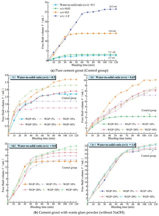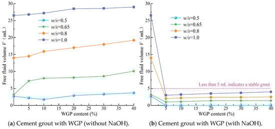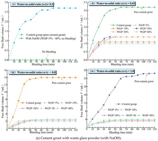 It is noteworthy that when WGP is added to cement grout with a water–solid ratio (w/s) of 0.65 without an alkaline activator, the volume of free liquid separated from each 100 mL of grout increases from 3.2 mL (3.2%) to 7.2–10.1 mL (7.2–10.1%). This transformation indicates that the grout changes from a stable grout to an unstable one (Figure 6a). For cement grout with a w/s ratio of 0.5, the volume of free liquid separated from each 100 mL of grout increases from 2.7 mL (2.7%) to a maximum of 3.7 mL (3.7%) after the incorporation of WGP. This means that when the waste glass content does not exceed 40%, the waste glass–cement grout with a w/s ratio of 0.5 remains stable (Figure 6a). The performance test results of multi-component mixed grouts incorporating WGP reported in references [65,66] also indicate that WGP has a significant impact on the fresh properties of the slurry, and the stability of the waste glass powder–cement grout increases with the addition of WGP. These findings are similar to those of the present study.