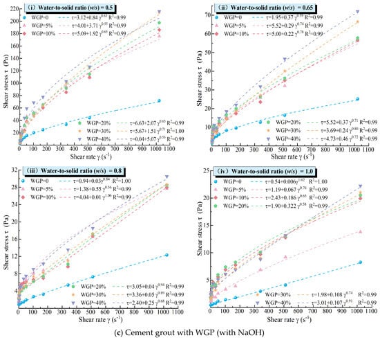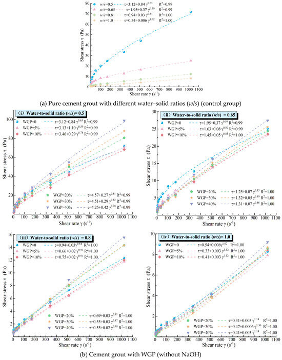 Based on the test results, the shear rates and corresponding shear stresses of the grouts under different mixing ratios were calculated and plotted as scatter data. Fitting analyses using the Bingham model, Power-law Model, Herschel–Bulkley (H-B) Model, and Carson Model were conducted to determine the optimal rheological model. As shown in Figure 7a, the optimal rheological model for plain cement paste, obtained through fitting analysis, is the H-B model (τ = τ0 + k γn), where τ is the shear stress (in Pa), τ0 is the initial yield stress (in Pa), representing the minimum shear stress required for fluid flow, k is the consistency coefficient (in Pa·sn), related to the fluid’s viscosity, γ is the shear rate, and n is the flow behavior index, describing the relationship between shear stress and shear rate. When n = 1, the fluid exhibits Newtonian behavior, with shear stress proportional to shear rate. When n < 1, the fluid is pseudoplastic, meaning that shear stress increases more slowly as the shear rate increases. The H-B model showed an excellent fit to the rheological performance test data for cement grouts with different w/s ratios, with R2 values exceeding 0.99 for all data, indicating that the H-B model can very accurately explain and predict the variations in the data. Specifically, for the grout with a w/s ratio of 1.0, n ≈ 1, indicating Bingham fluid behavior. For grouts with w/s ratios of 0.5, 0.65, and 0.8, n < 1, indicating pseudoplastic fluid behavior. Therefore, the H-B model was used to fit and analyze the rheological test data for cement grouts containing WGP, and the results are shown in Figure 7. Clearly, the H-B model provided a good fit for the rheological behavior of waste glass–cement grouts under different conditions, indicating that the H-B model effectively characterizes the rheological properties of these grouts. The research conducted by Yin et al. [66] on the rheological properties of cement-based grouting materials containing WGP, water-reducing admixture, and viscosity-modifying admixture (VMA) revealed that the slurry incorporating WGP conforms to the Herschel–Bulkley rheological model and exhibits a significant shear-thickening response. These findings are consistent with those of the present study. Similar conclusions have also been drawn from research on cement-based composites reported in references [68,69].