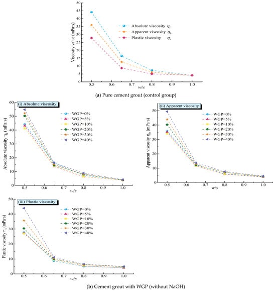 Rheological tests were conducted on tap water and aqueous solutions of NaOH with w/s ratios of 0.5, 0.65, 0.8, and 1.0. The results showed that both the NaOH solutions and tap water exhibited Newtonian fluid behavior, and their absolute viscosity (Newtonian viscosity) values were calculated. The absolute viscosity of tap water was found to be 0.8 mPa·s, while the absolute viscosities of the NaOH solutions corresponding to w/s ratios of 0.5, 0.65, 0.8, and 1.0 were 1.5 mPa·s, 1.2 mPa·s, 1.0 mPa·s, and 0.9 mPa·s, respectively. Clearly, the absolute viscosities of the NaOH solutions were all higher than that of tap water, and as the w/s ratio increased (i.e., the NaOH content decreased), the absolute viscosity gradually decreased from 1.5 mPa·s at a w/s ratio of 0.5 to 0.9 mPa·s at a w/s ratio of 1.0. This indicated that the addition of NaOH increased the viscosity of the solution, and the higher the concentration, the more significant the increase in viscosity. This was one of the reasons for the noticeable increase in rotational viscosity of waste glass–cement grout under activator conditions. However, this increase was relatively limited, with a maximum increase of only 0.7 mPa·s. To further elucidate the effects of alkali activator and WGP content on the viscosity of cement grout, the absolute viscosity (ηJ = Φ300), apparent viscosity (ηb = Φ600), and plastic viscosity (ηs = Φ600 − Φ300) of the grouts under different conditions were calculated based on the rheological test results, as shown in Figure 8 and Figure 9.