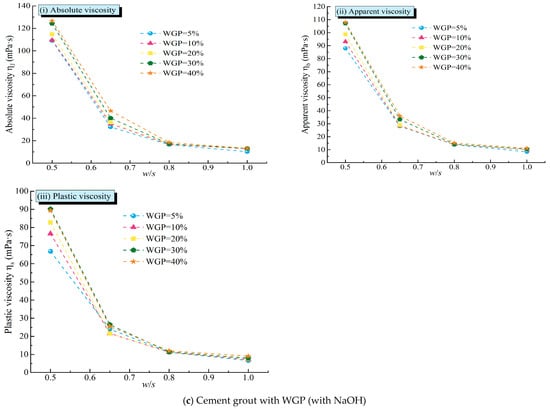 The viscosity of cement grout with different amounts of WGP varies with the water–solid ratio (w/s).