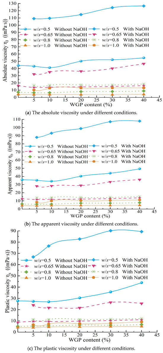 Notably, this study focuses on the stability and rheological properties of slurries prepared by mixing WGP with P.O 42.5 ordinary Portland cement under different w/s ratios, both with and without the addition of NaOH. Therefore, important areas for future research include the compatibility of WGP with different types of cement, optimization of WGP content and activator dosage, and exploration of more environmentally friendly activators.