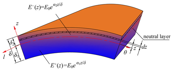 Now let us derive the strain energy Uε2 of the bending deformation. Due to the introduction of a bimodular effect on materials, two states of tension and compression will occur simultaneously along the thickness direction. In order to consider this phenomenon, it is necessary to differentiate the tensile zone from the compression zone, and to calculate their corresponding strain energies separately. Therefore, the strain energy of bending deformation can be expressed as