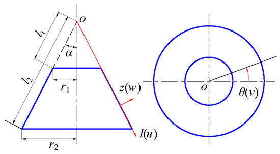 Coordinate system and geometric relation of truncated conical shell.