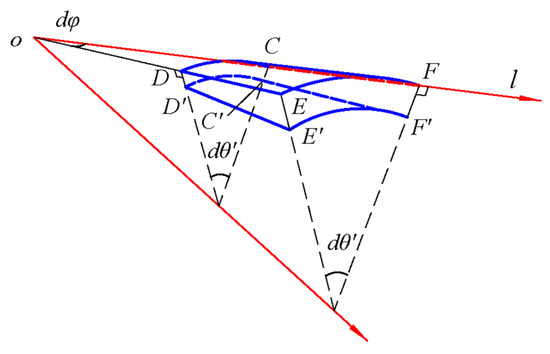 As shown in Figure 3, CDEF represents the initial position of the differential element on the middle surface, in which the length of CF and CD is dl and l∙dφ, respectively. C′D′E′F′ represents the changed position of the differential element on the middle surface caused by normal displacement w. Among them, CC′ and DD′ have the same length, indicating that the normal displacement of the conical shell under axisymmetric load is independent of the angle. CC′ and FF′ have different lengths, indicating that the normal displacement changes along the generatrix direction l. Note that the rotation angle of C′F′ with respect to CF is dw/dl, thus the length difference of CC′ and FF′ will give dl·(dw/dl). Therefore, the strain along the l direction caused by the normal displacement w may be computed as, by definition,