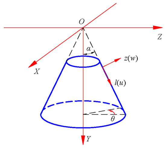 Note that the relation between the angle dφ rotating around the cone top and its projection angle dθ on the vertical plane, l∙dφ = l∙sinα∙dθ (see Figure 2 and Figure 3), we have