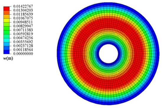 Due to the axisymmetric nature of the load and structure, the influence of normal displacement on the circumferential strain εθ has been considered in the small deflection theory. The small deflection equation for conical shells has been applied in previous study [5]. Combining with Equation (10), the in-plane and out-of-plane geometric equations for the large deflection of conical shells give