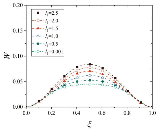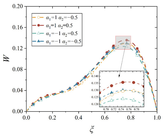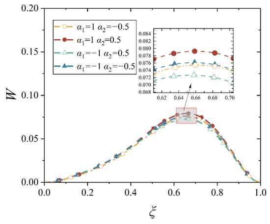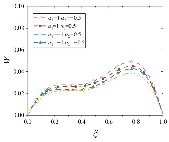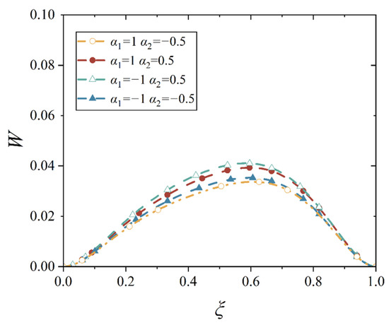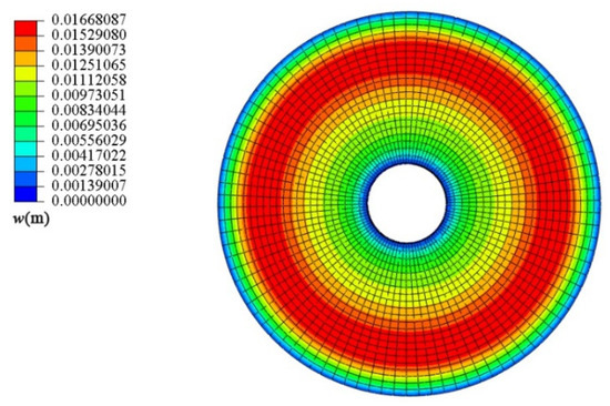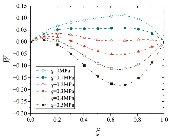 In general mechanics of materials, it is known that the first-order derivative of deflection, dw/dl, represents the rotation angle when it is related only to rotation due to bending, and the second-order derivative of deflection, d2w/dl2, is proportional to the bending moment. However, in the shell, there is almost no such point whose rotation angle and the bending moment are zero simultaneously, which indicates that the assumption in Equation (13) is not valid, and thus, we can only obtain