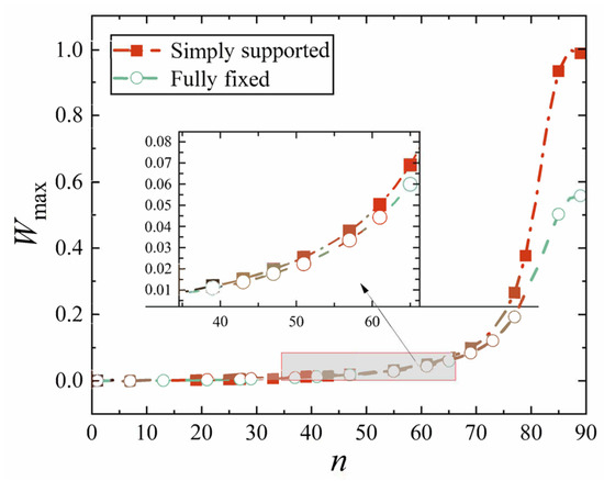 The dimensionless maximum deflection Wmax of conical shell under thermal load.