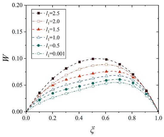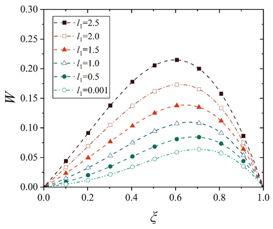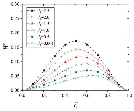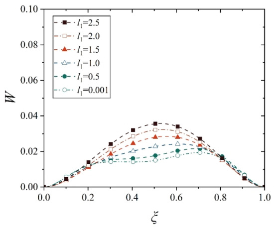 This study only considers the non-uniform thermal distribution along the thickness direction, so the thermal stress is only a function of z. Obviously, E−(z), α(z), and T(z) are only functions of z, and the displacements w and u are only related to l. First, we calculate the integral of thermal stress along the thickness direction, which is called the thermal membrane force NT, and is expressed as