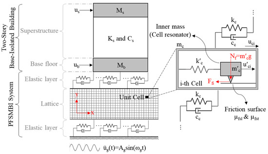 where Mss (6 × 6) is the mass submatrix corresponding to the base-isolated building, including both the superstructure and the base floor; Mmm (2 Nc × 2 Nc) is the mass submatrix corresponding to the lattice; and are the mass submatrices linking the degrees of freedom of the base-isolated building to those of the cells and their resonators. In this case, these submatrices are equal to . The corresponding damping and stiffness submatrices can be defined in a similar manner using the damping and stiffness matrices presented in Appendix A. Furthermore, in Equation (13), (6 × 1) and (2 Nc × 1) are the displacement vectors of the floors and the lattice (i.e., both cells and their resonators), respectively; and are the earthquake influence vectors of the floors and the lattice; and Ff(t) is the friction force vector.