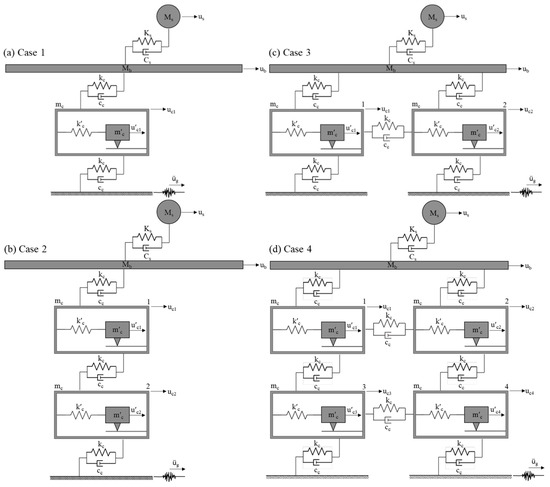 In this section, we derive the equation of motion for the dynamic model of a two-story base-isolated building equipped with the PFSMBI system in its most basic configuration, which includes only a single cell (i.e., Case 1 with Nc = 1). Figure 2 shows this dynamic model. In subsequent sections, additional configurations involving multiple cells (i.e., Case 2–4) will be studied to provide a comprehensive analysis of the dynamic behavior of the PFSMBI system.