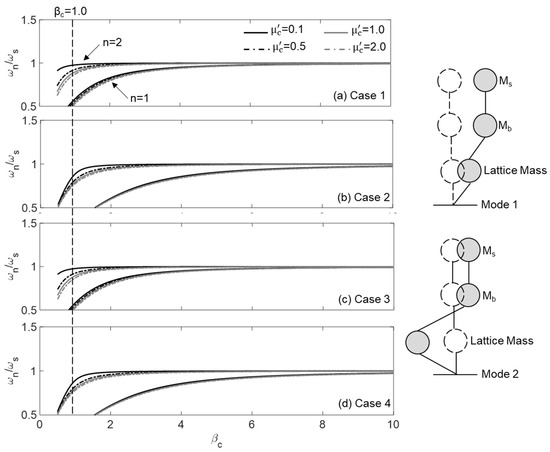 Fundamentally, only the first two modes of a base-isolated building model are significant. The first mode (n = 1) represents the rigid body motion of the building, which occurs due to the flexibility of the lattice, while the second mode (n = 2) captures the deformation within the lattice, as illustrated in Figure 4. Figure 4a–d shows the variation in the natural frequencies of these two modes for Cases 1–4, with respect to βc for 0.1, 0.5, 1.0, and 2.0. It is also assumed that 1.0 and . It should be noted that βc governs the flexibility of the lattice and, consequently, the performance of the PFSMBI system. By adjusting this parameter, the building’s natural frequencies can be shifted to lower ranges, thereby mitigating the risk of resonance at higher frequencies. As shown in Figure 4, for small values of βc (e.g., βc ≤ 1.0) in all cases, the natural frequencies of Modes 1 and 2 are well separated, indicating the effectiveness of the PFSMBI system. A similar effect is observed when is increased, though the influence is not substantial. However, as βc increases, the ratio ωn/ωs for both modes tends to approach 1.0, which indicates a reduction in the effectiveness of the PFSMBI system, regardless of the value of . Another notable observation from the figure is that the values of the natural frequencies for Modes 1 and 2 are similar between Cases 1 and 3, as well as between Cases 2 and 4. However, the lattice in the latter two cases is more flexible (having a lower ωn/ωs ratio), indicating their superiority over Cases 1 and 3. A more detailed comparative study will be conducted in Section 5.