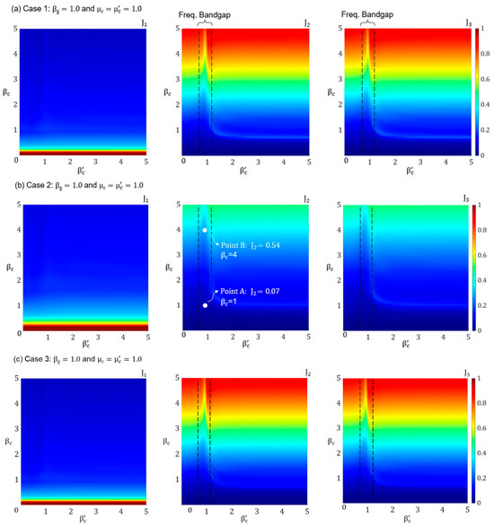 From Figure 7a, it is evident that, for a softer lattice, the PFSMBI system demonstrates optimal performance for 0.90 ≤ βg ≤ 1.75 when all three performance indices, J1, J2, and J3, remain well below 1.0. However, the system’s performance decreases significantly for βg ≤ 0.75, with J1 increasing substantially due to the high frequency of the input excitation. The influence of (i.e., the mass damping of the cell resonators) on J1 is minimal; however, it can be noted that an increase in enhances the performance of the PFSMBI system, particularly when βg = 1.0. For a stiffer lattice, Figure 7b indicates that the PFSMBI system achieves optimal performance when βg ≥ 0.90 and > 1.0, with J1, J2, and J3 less than 1.0. Overall, it is observed that improved performance is correlated with an increase in .